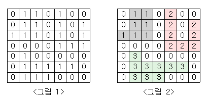 <그림 2>는 <그림 1>을 단지별로 번호를 붙인 것이다. 지도를 입력하여 단지수를 출력하고, 각 단지에 속하는 집의 수를 오름차순으로 정렬하여 출력하는 프로그램을 작성하시오.